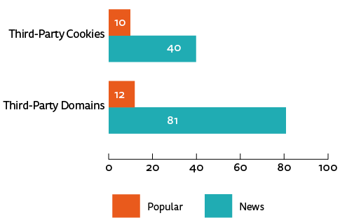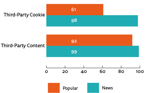The difference between news and other popular sites is most profound when looking at the volume of third-party content requests and cookies per page, captured in figure 4. News sites have an average of 40 third-party requests per page compared with 10 for popular sites. Likewise, news sites have an average of 81 cookies per page compared with 12 for popular sites.