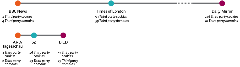 - News sites based on different funding models include different numbers of third-party domains and cookies. A strategic sample of news sites in the UK and Germany reveals that popular newspapers (often heavily reliant on advertising revenues) have the most third-party content and cookies, upmarket newspapers (that rely on advertising as well as subscription revenues) have a medium amount, and public service media (that are not reliant on advertising or subscriptions) have relatively few.