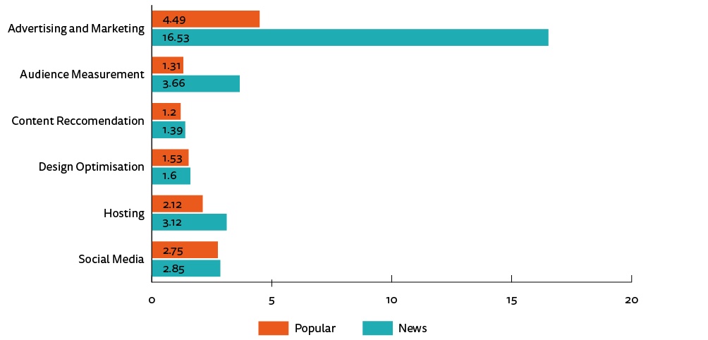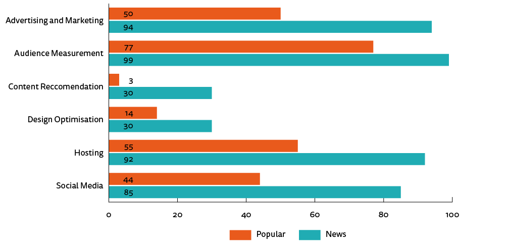 The most prominent type of content on all sites is audience measurement, which is on 98% of news and 77% of popular sites. This is driven primarily by the presence of Google Analytics, found on 74% of sites. On popular sites, only two other types of content are on more than half of pages (advertising and marketing, and hosting), whereas on news sites four of the six types are present on between 85 and 98% of all sites. The largest difference is in the content recommendation category, which is highly news specific: 30% of news sites include this type of content compared with only 3% of popular sites.