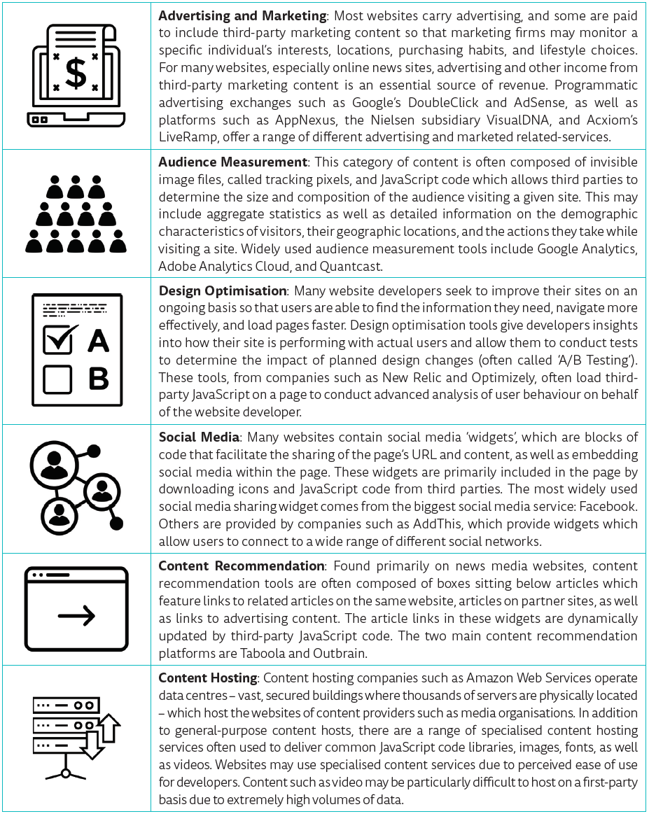 Six dominant use categories are explored in this study: advertising and marketing, audience measurement, design optimisation, social media, content recommendation, and content hosting. They are described in the boxes above: