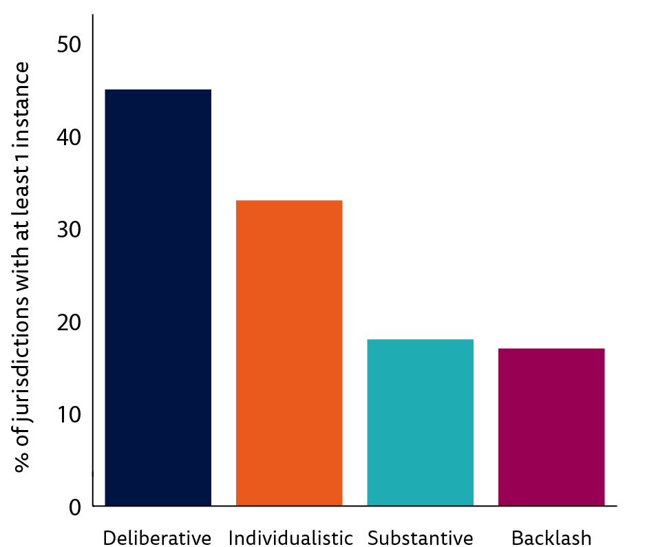 Investigations were by far the most common deliberative result, with at least one instance in 34 percent of jurisdictions tracked, again confirming earlier research. This reflects the breadth of the category, which also includes civil and criminal inquiries leading to individualistic outcomes. Commissions, taskforces, hearings, and similar forums were evident in just under 10 percent of jurisdictions, while public demonstrations took place in 3 percent.