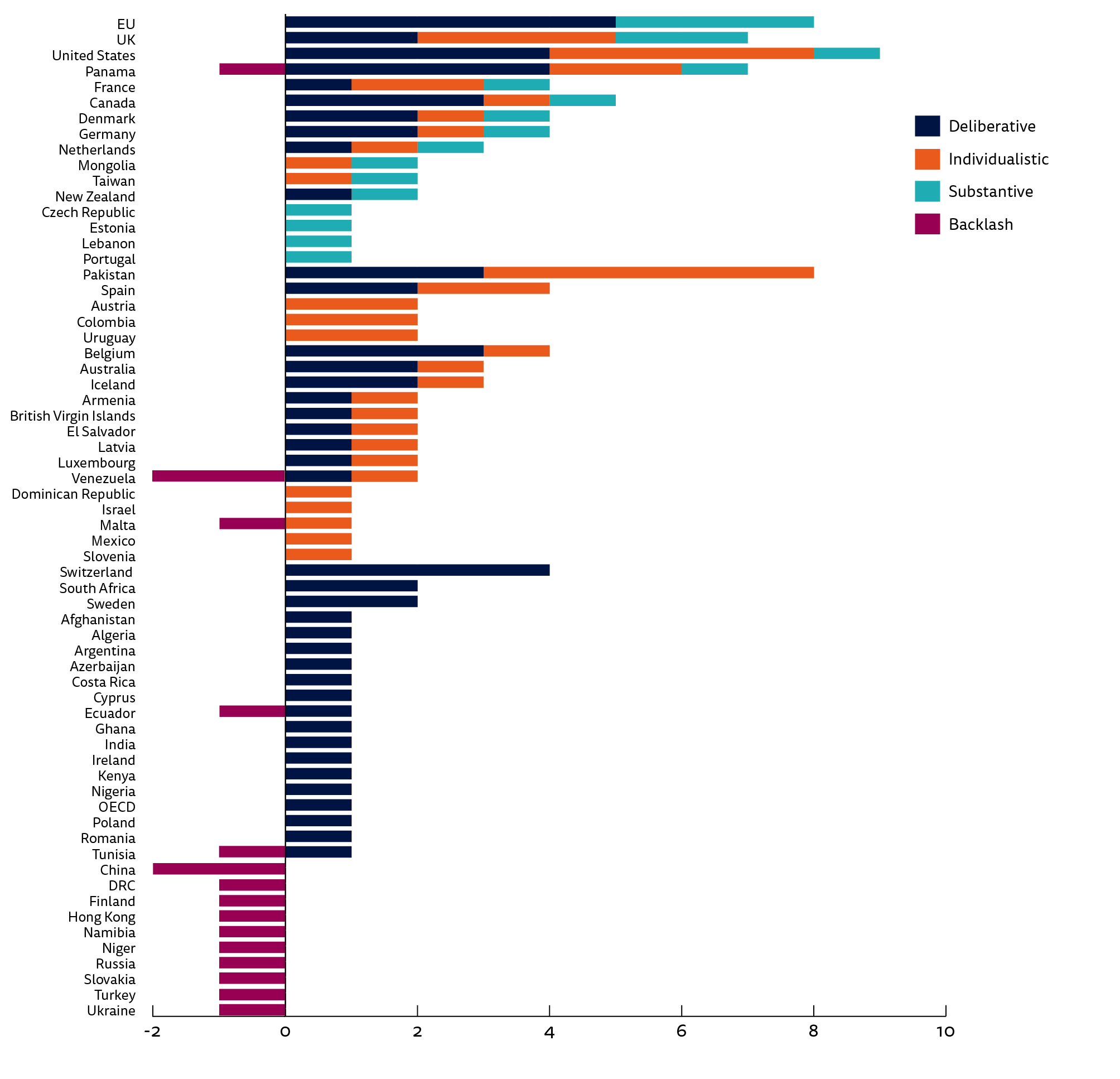 A much wider range of countries, covering nearly every region, saw either a combination of deliberative and individualistic impacts, or only some form of deliberation. (In many cases the deliberative outcome was an investigation which could lead to an individualistic result like levying fines, recouping taxes, or criminal prosecution.) And finally, a cluster of countries including several notably authoritarian regimes – eg, China, Russia, and Turkey – saw only instances of backlash.