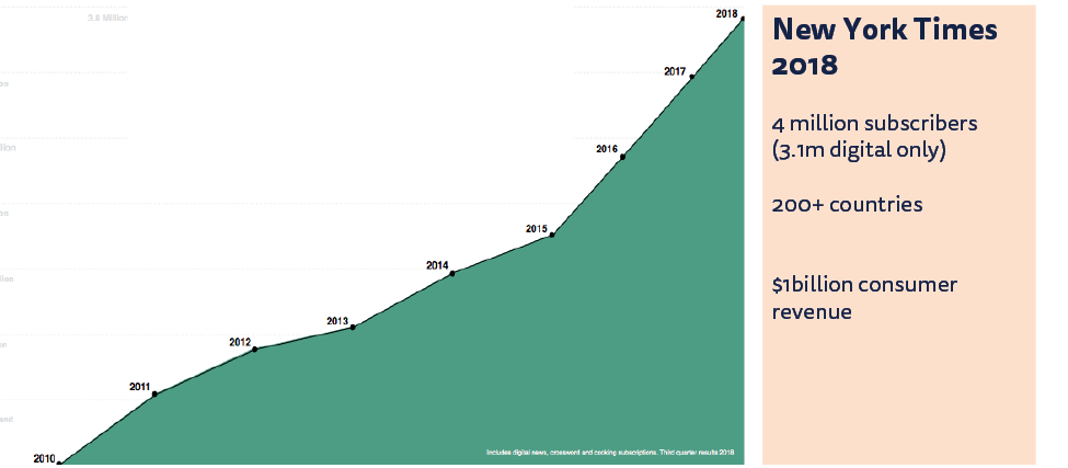 On the plus side, some publishers that have re-focused on ‘reader payment’ are thriving. The New York Times is now running at four million subscribers (3.1m digital) with a mantra that every piece of content should be worth paying for.