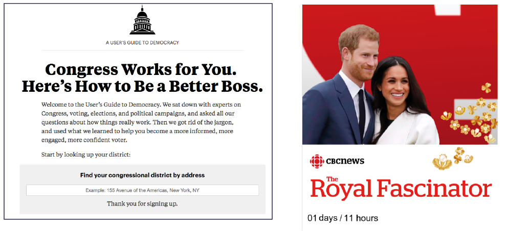 One consequence of the shift in business models is the focus on developing loyalty and retention, which is why newsletters are making a comeback, with more publishers reclaiming them from marketing teams. One new trend for 2018 was the development of pop-up newsletters, designed to drive episodic engagement. CBC ran an eight week series on the Royal wedding called the Royal Fascinator. Politico experimented with an eight week series of explainers and tools aimed at educating younger voters. The format engaged over 8,000 people with open rates of over 55%.