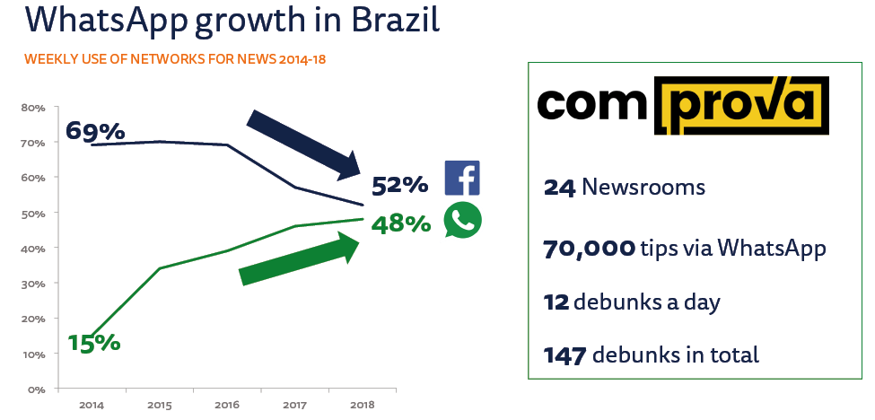 Our Reuters Institute Digital News Report has tracked the growing importance of WhatsApp and other messaging platforms particularly in developing countries (see chart below). Around 120m people use WhatsApp in Brazil and with politics deeply polarised this closed network has increasingly turned into a political battlefield. The Brazilian elections were something of a test case for whether it is possible to track and debunk misleading information in WhatsApp.
