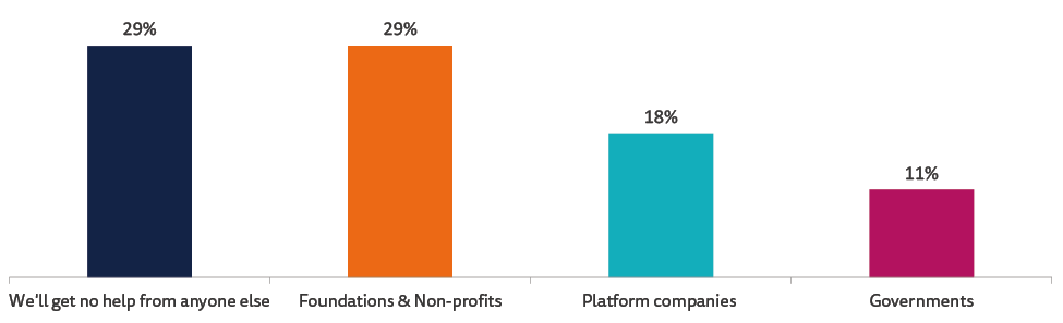 - At the same time, there seems to be a growing acceptance that some types of quality news provision might need to be subsidised. Almost a third (29%) expect to see significant help this year from foundations and non-profits, a fifth (18%) expect tech platforms to contribute more, while one in ten (11%) think governments will provide more support. A further 29% of publisher respondents is not expecting any of the above to ride to their rescue.