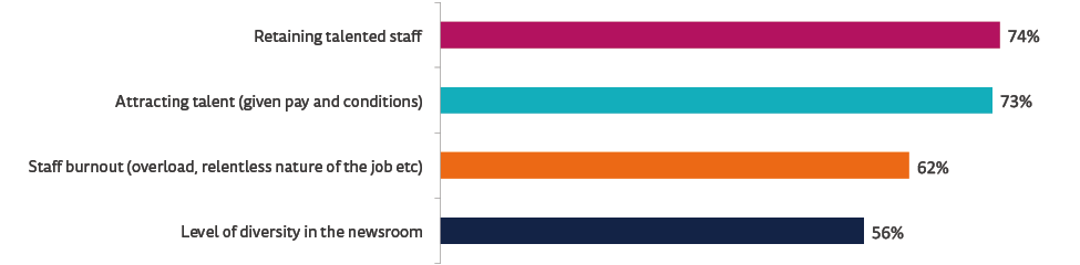 - Almost two thirds (61%) are concerned or extremely concerned about staff burnout. Retaining (73%) and attracting (74%) staff is a particular headache, given the low rates of pay, relentless pace and pressures of a modern newsroom. Over half (56%) are concerned about levels of newsroom diversity.