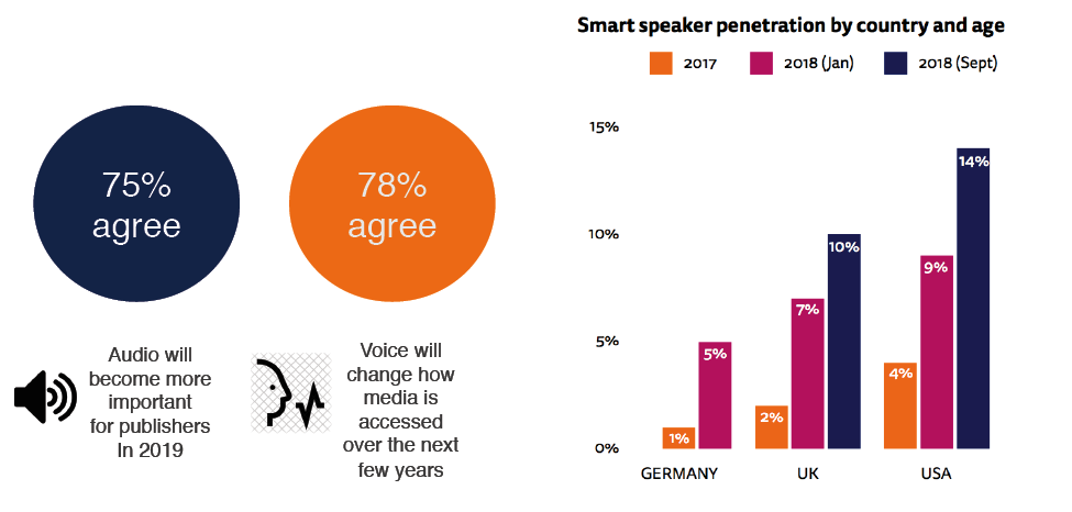 - With many publishers launching new daily news podcasts, it is perhaps not surprising that the majority (75%) think that audio will become a more important part of their content and commercial strategies. A similar proportion (78%) think that emerging voice-activated technologies, like Amazon Alexa and Google Assistant will have a significant impact on how audiences access content over the next few years.
