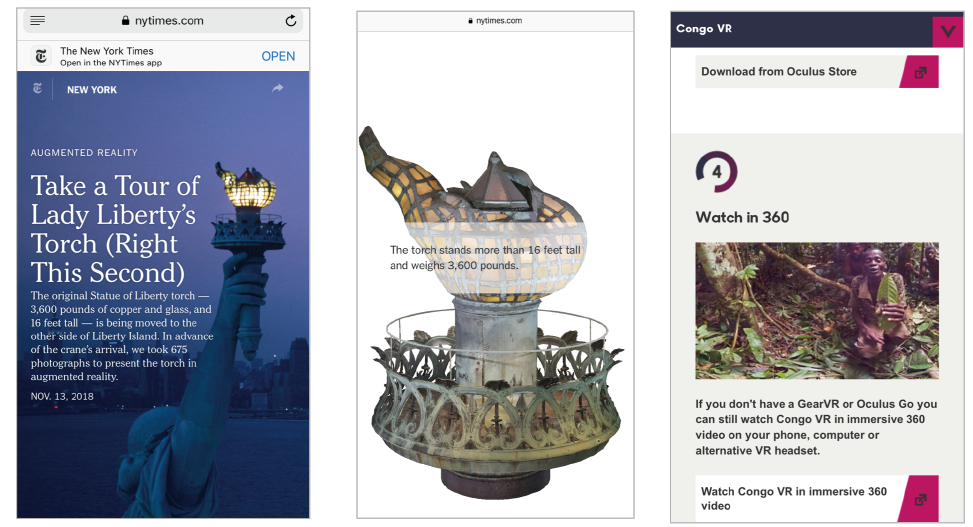 The majority of consumption is for content that can be easily viewed on mobile devices without additional plugins – such as 360 video and 3D experiences. In November the New York Times immersive team captured the Statue of Liberty torch, ahead of its move for restoration. The BBC streamed all 33 World Cup games in VR with its app downloaded more than 300,000 times. Meanwhile, in December it released a three-part VR documentary about the Congo river, a sequel to last year’s documentary about the water politics of the Nile.