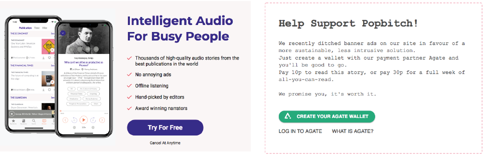 Agate is a digital wallet that allows you to pay for premium articles as you go. Publishers like Popbitch (see figure above) and the New European can set their own pricing at a story level or for a period of time. Consumers can top up when they run out cash. These schemes aim to make it easier to consume premium content from multiple brands without hitting paywalls; the problem will be getting a critical mass of publishers to take part.