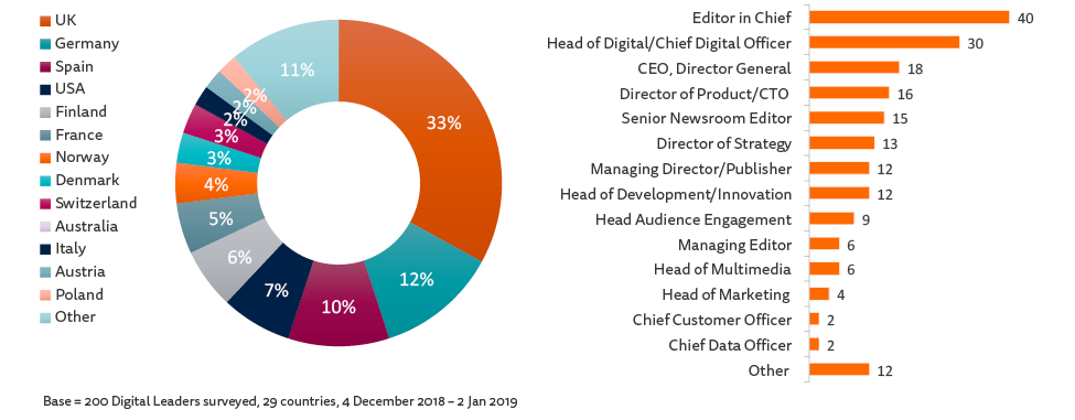 200 people completed a closed survey in December 2018. Participants were selected because they held senior positions (editorial, commercial, or product) in traditional or digital-born publishing companies and were responsible for aspects of digital strategy.