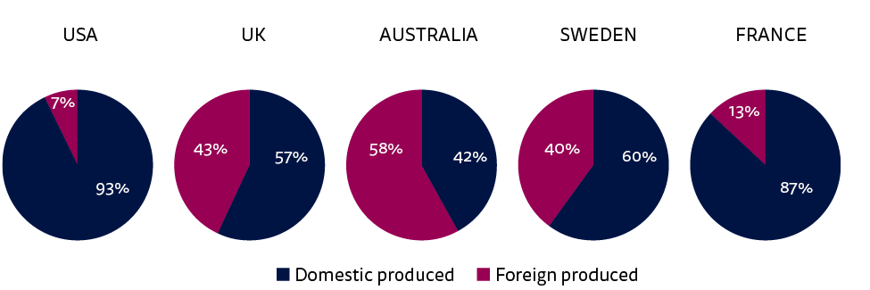 By contrast, in the United States and France, the podcast scene is dominated by local producers, albeit for very different reasons. In the United States only 13 of the top 200 shows (7%) are non-domestic, with half of those being British. Strong domestic competition makes it extremely hard to break into this American market. In France almost nine in ten (87%) of our trending podcasts were locally produced, with language clearly a factor.