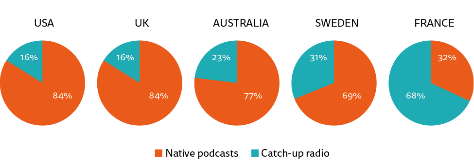 The next chart shows the proportion of trending news podcasts that are native (digital-born), as opposed to catch-up radio content, across our five countries.
