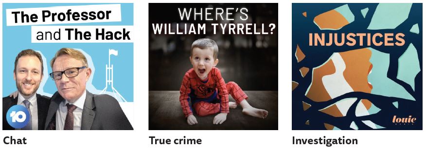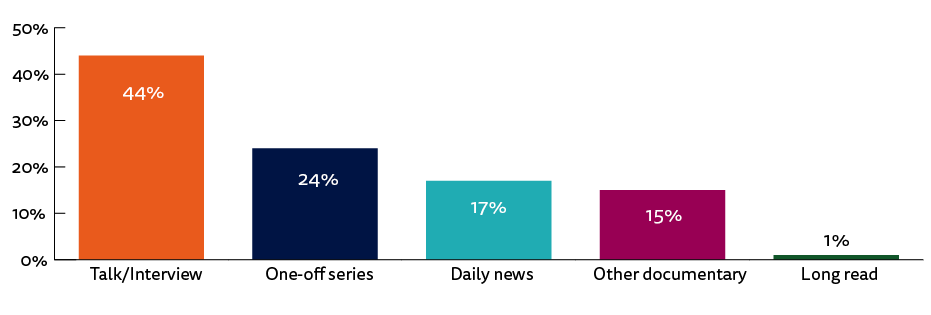 The one-off narrative series is another popular format (24%), with true crime hits coming from the US, as well as Australia and the UK. The Teacher’s Pet was a true crime podcast from the Australian that was downloaded more than 30 million times. The Assassination from the BBC was an award-winning investigation into the death of Pakistani politician Benazir Bhutto.