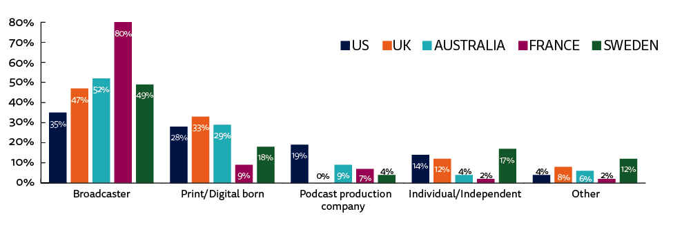 - What types of news podcasts are being produced, who is producing them, and how does that differ across countries?