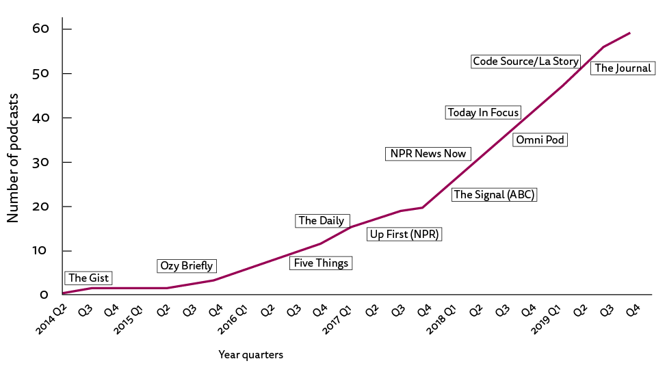 The category itself is also growing rapidly. The number of new news podcasts globally rose by almost 12,000 between January and October 2019 – an increase of around a third (32%) according to data provided by Chartable. Talk and interview shows are the most popular sub-genre within news, along with one-off narrative series, but daily news has become an increasingly important focus. We have identified almost 60 native daily news podcasts across our five countries (see full list in Appendix B) with the majority of these shows having launched in the last 18 months. Some of the most popular daily news podcasts in the United States – such as The Daily from the New York Times – are attracting audiences of millions, while others are struggling in an increasingly competitive market. Elsewhere audiences are more modest but are showing consistent growth. We have identified three sub-categories of daily news podcasts: