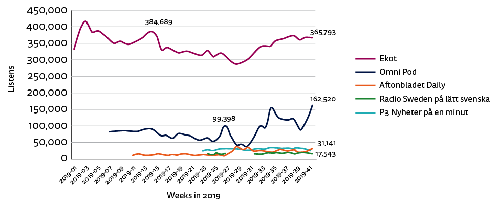 Understanding podcast consumption is more challenging so we have used a variety of sources. We have used survey data (Edison Infinite Dial and Digital News Report) to help put podcasts into a wider context as well as provide robust data on demographics. The Apple Podcasts Episode charts, based on recent usage around specific shows, help provide a picture of relative consumption – even if actual numbers are not publicly available. To help fill in these gaps, we have in some cases used consumption data provided directly by individual publishers, or we have referenced aggregated publisher data from Podtrac in the United States and Poddindex in Sweden.