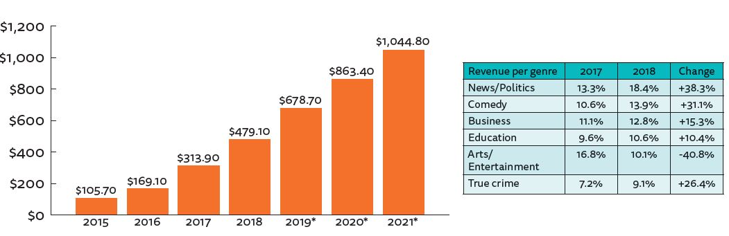 17 IAB FY 2018 Podcast Ad Revenue Study, conducted by PwC, https://www.iab.com/wp-content/uploads/2019/06/Full-Year-2018-IAB-Podcast-Ad-Rev-Study_6.03.19_vFinal.pdf