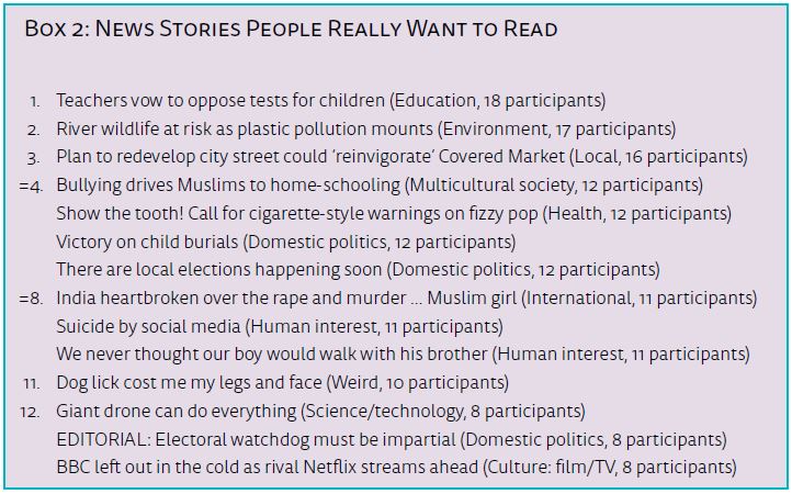 We agree with Cherubini and Nielsen that ‘all forms of analytics have to confront … the limitations involved in using quantitative indicators to understand the messy and diverse realities of how people engage with journalism, why, and what it means’ (2016: 34). As the next section lays out, this study is designed to find alternative methods for understanding people’s interest in public affairs news. To do this we begin with the assumption that people’s interest starts with particular stories and topics, rather than with abstract categories like ‘politics’ or ‘international news’. We also make room for people to offer their own accounts of the value – including potential civic or democratic value – of the stories they choose to read.