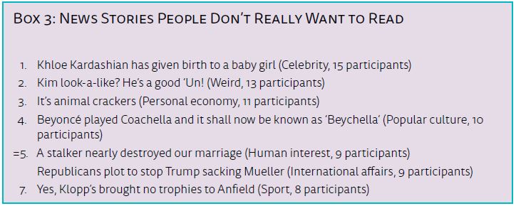 This report draws mainly on results of the card sorting in stage 3. For this exercise, each story was represented on a simple card showing a headline and a brief subheading, printed in a neutral font (see Box 1 and Appendix A). In order to focus on content preferences, the cards did not include brand characteristics or visual elements like photographs. Participants were handed the 36 news story cards and asked to sort them into three piles: stories they would probably want to read if they came across them online, in print, or on social media; stories they probably would not want to read; and in between a pile with stories they might want to read, time and place permitting.