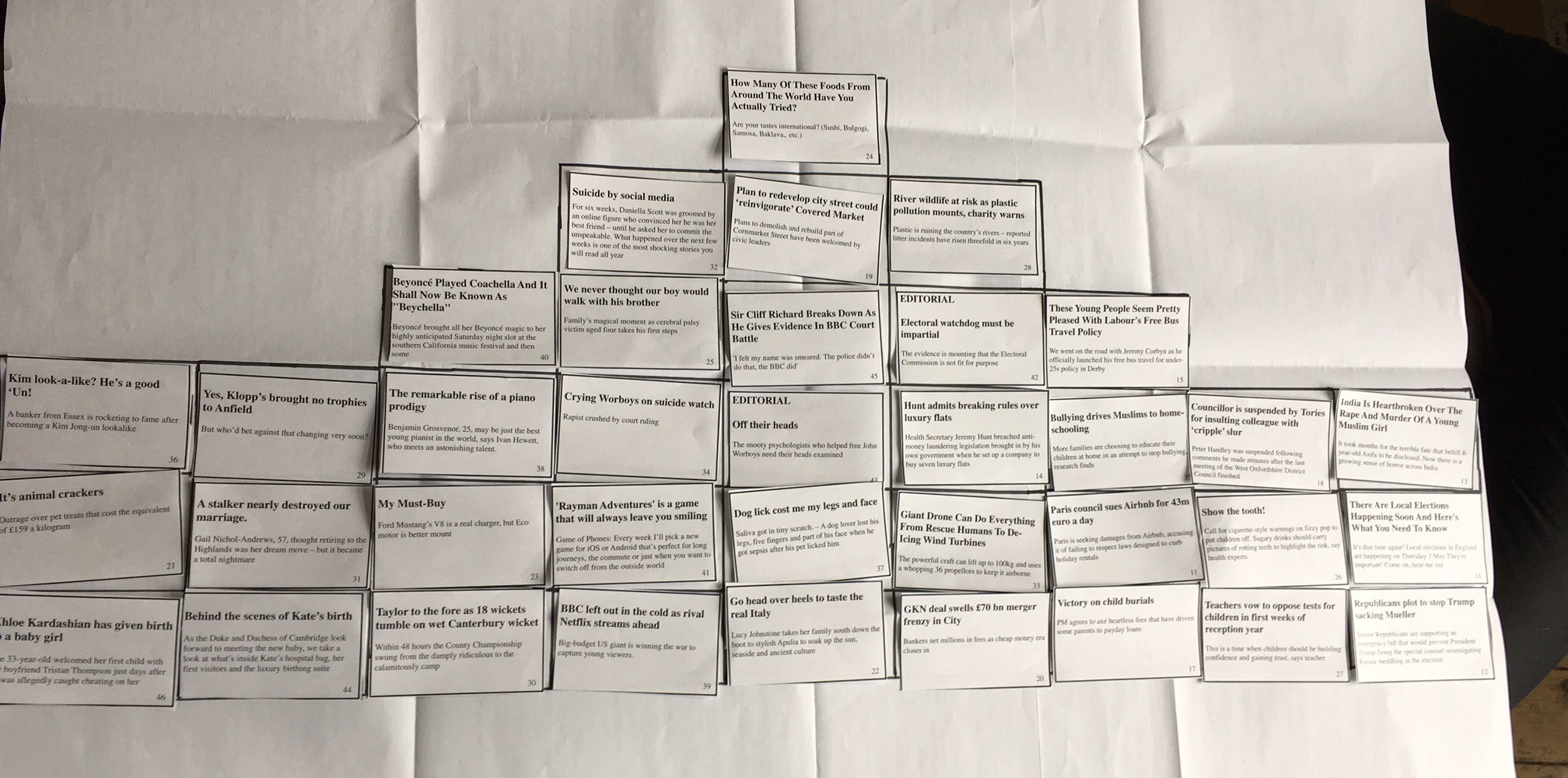 The 36 news stories were drawn from the cross-media, cross-platform news universe in Oxford, spanning national as well as local outlets. All were published in April and May 2018; sources included print and online editions of the Sunday Telegraph, The Times, BuzzFeed, Huffington Post, Cosmopolitan, Woman’s Own, Sunday Mirror, Oxford Mail, Guardian, Daily Star, Sun, Observer, and Mail on Sunday. The stories were selected to carry appeal in terms of diverse interests, tastes, and styles across the social and cultural spectrum. Stories were also selected for potential long-term interest; breaking news could not be included, since the study was carried out over several weeks.