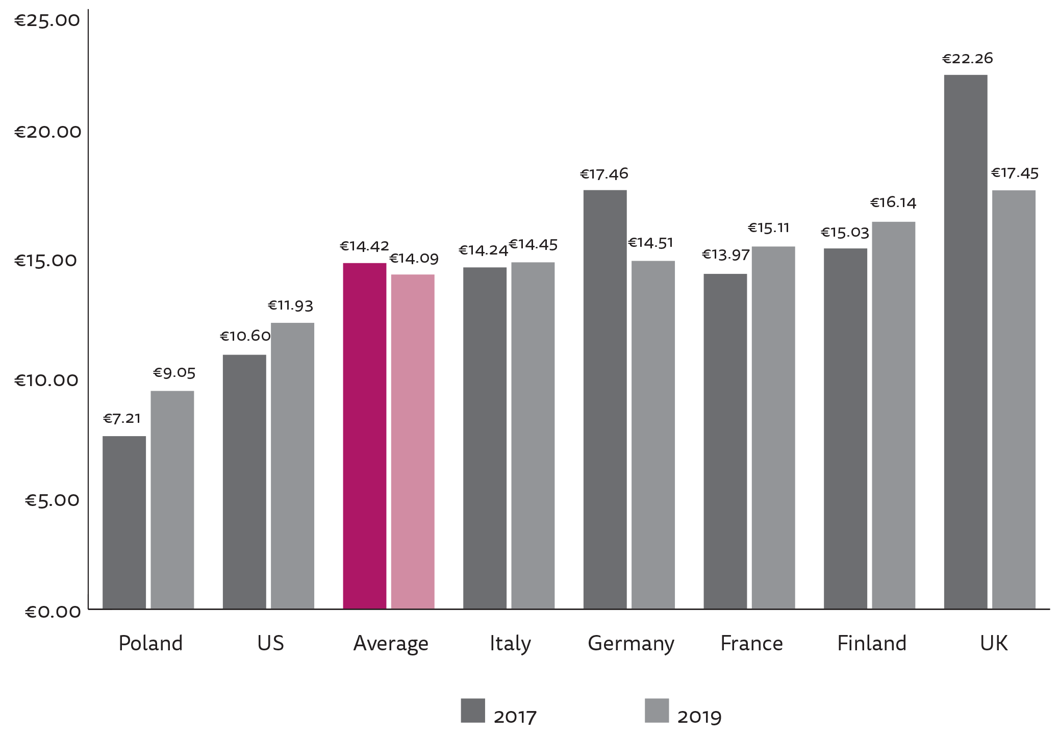 - Monthly prices vary dramatically across titles and countries (see Figure 2). Looking specifically at newspapers and weeklies, Poland has the lowest average monthly price at €9.05 (£7.84). The UK has the lowest percentage of newspapers and weeklies with pay models (33%) but the highest average monthly price at €17.45 (£15.12), peaking at €41.50 (£36) for the Financial Times.