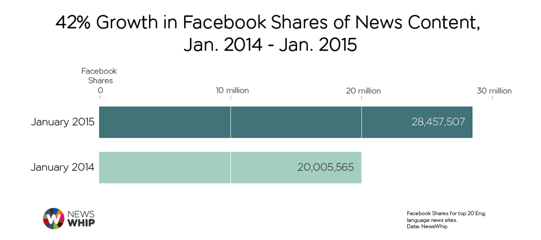 These findings are backed up by industry data from NewsWhip, which monitors the numbers of shares of publisher-based content across multiple countries and languages.1 After Facebook changed its algorithms to favour quality news sites at the end of 20132 they reported a significant increase in referrals to major sites.