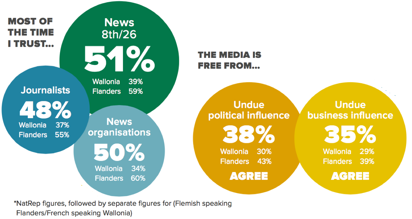 News brands enjoy high levels of trust in Belgium, which might be due to a general lack of explicitly partisan media, no recent scandals involving the press and well-functioning self-regulation through the Council of Journalism. There is, however, a remarkable difference in trust levels between Flanders and Wallonia, with much higher levels of trust in Flemish speaking areas.