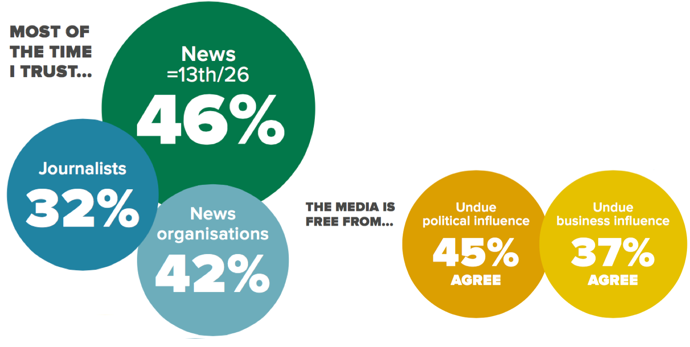 Norway has average levels of trust with low levels of political polarisation in the media. Trust may have been affected by several factors in 2015: the growth of sponsored content, clickbait tendencies in online media, or the scandal around a journalist systematically plagiarising content.