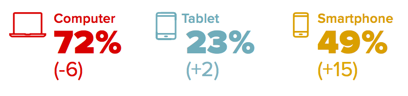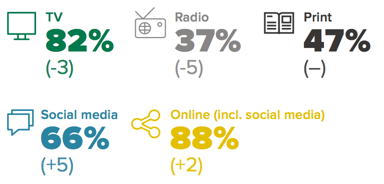 The past year has seen a significant rise in smartphone use for news (+15), as well as a strong increase in social media for news.