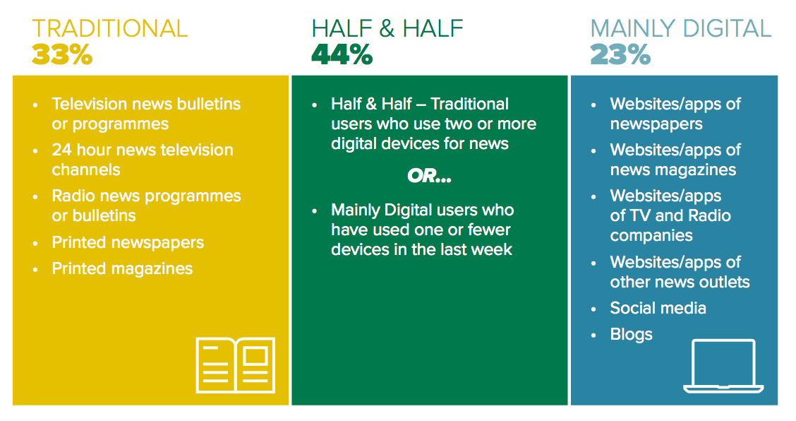 Our first segmentation categorises respondents into those that exhibit traditional approaches (mainly TV, radio and print) and those that are mainly digital in the way they consume the news. We also identify a sizeable group that are half and half (platform agnostic). The following table explains how these segments have been achieved.