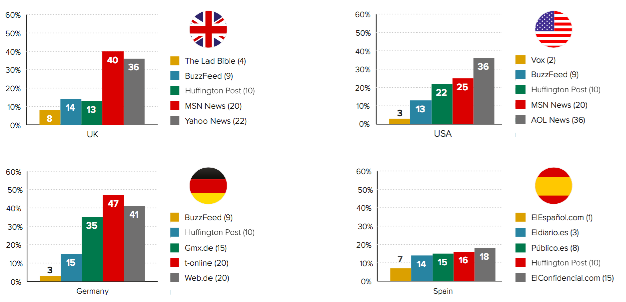 Base: All who used BuzzFeed/Huffington Post/Gmx.de/t-online/Web.de ElEspanol.com/Eldiaro.es/Publico.es/Huffington Post/ElConfidencial.com: Germany = 32/161/267/298/300, Spain = 148/372/290/302/421.