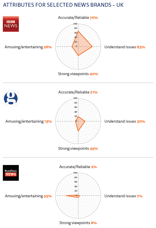 Base: All that used BBC News online/Guardian online/BuzzFeed News in the last week: UK = 1076/378/174.