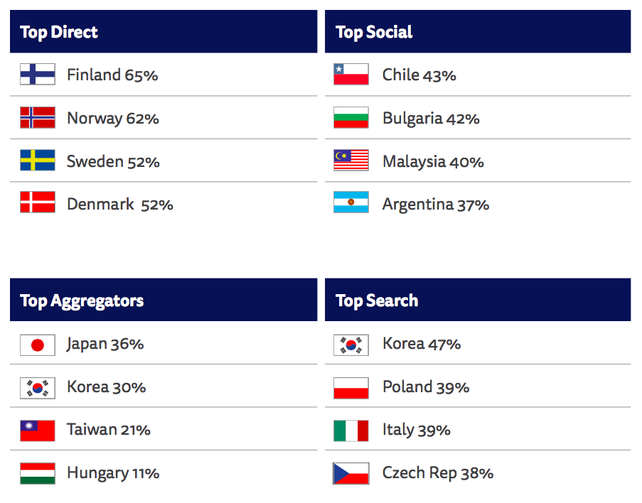 Behind the averages, however, we find very significant country differences. Two-thirds of respondents in Finland (65%) and Norway (62%) prefer to go direct to a website or app. Elsewhere, preferred access is often via social media, with over four in ten preferring this route in Chile (43%), Bulgaria (42%), and Malaysia (40%). In some Asian countries, aggregators or search are the main gateways. In South Korea, where Naver and Daum are dominant platform players, 47% say they prefer to access via search and 30% via a news aggregator. Just 5% prefer to go directly to a news website or app, by far the lowest in our survey. In Japan, where Yahoo! is the main news portal, the figure is just 15%.