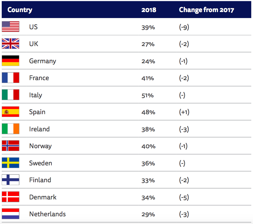 Ad models continue to be undermined by low rates of return, fraud, and increased consumer concerns about privacy. After a pause in growth last year, the use of ad-blockers is on the rise again, alongside privacy browser extensions that allow specific advertisers to be blocked. More than four in ten (42%) now use blockers in Greece (+6) with significant increases in Germany (+5) and the United States (+4). Concerns about privacy may be driving these changes along with greater awareness.