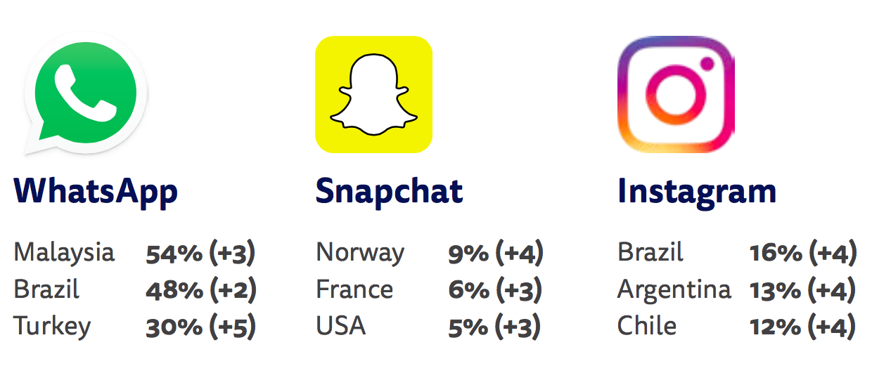 There have also been substantial increases in the use of other networks in a number of countries. WhatsApp and Instagram have taken off in Latin America and parts of Asia. Snapchat is making progress in parts of Europe and the United States, particularly with younger users.
