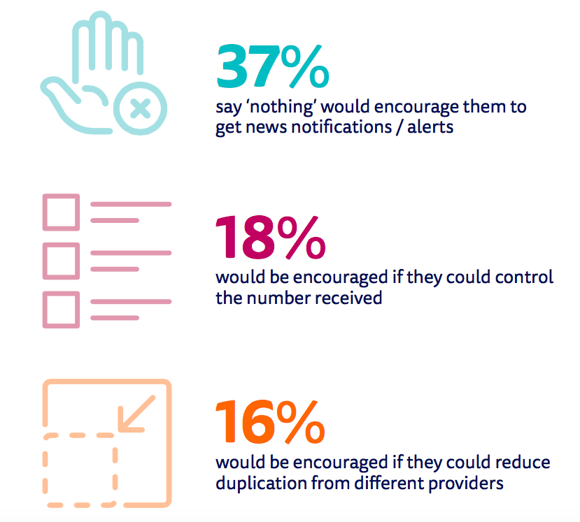 Around four in ten of those not using alerts (37%) say that nothing would persuade them to sign up. But there are opportunities amongst other smartphone users who are interested in news but so far have been reluctant to sign up. The main barriers are the fear of being bombarded with notifications (18%), and concern about receiving the same alert multiple times (16%).