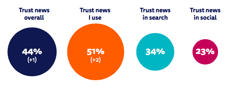 - Across all countries, the average level of trust in the news in general remains relatively stable at 44%, with just over half (51%) agreeing that they trust the news media they themselves use most of the time. By contrast, 34% of respondents say they trust news they find via search and fewer than a quarter (23%) say they trust the news they find in social media.