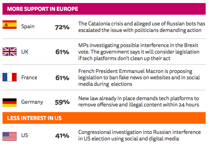 - There is some public appetite for government intervention to stop fake news, especially in Europe (60%) and Asia (63%). By contrast, only four in ten Americans (41%) thought that government should do more.
