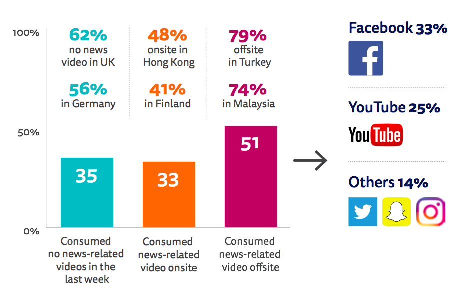 - Consumers remain reluctant to view news video within publisher websites and apps. Over half of consumption happens in third-party environments like Facebook and YouTube. Americans and Europeans would like to see fewer online news videos; Asians tend to want more.