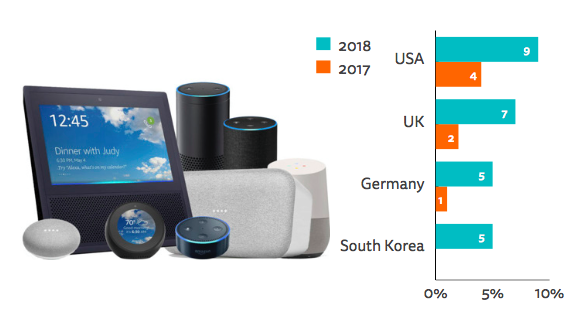 The Amazon Echo range (using the Alexa assistant) is the market leader but is only available in a few markets like the US, UK, Germany, and Australia. South Korea’s tech companies Naver and Kakao have their own devices, Apple has launched the HomePod, while the Google Home and Google Assistant will be expanded to over 30 countries this year. Usage for any purpose has more than doubled in early adopter markets. Almost one in ten (9%) now use them in the United States, 7% in the UK, and 5% in Germany.