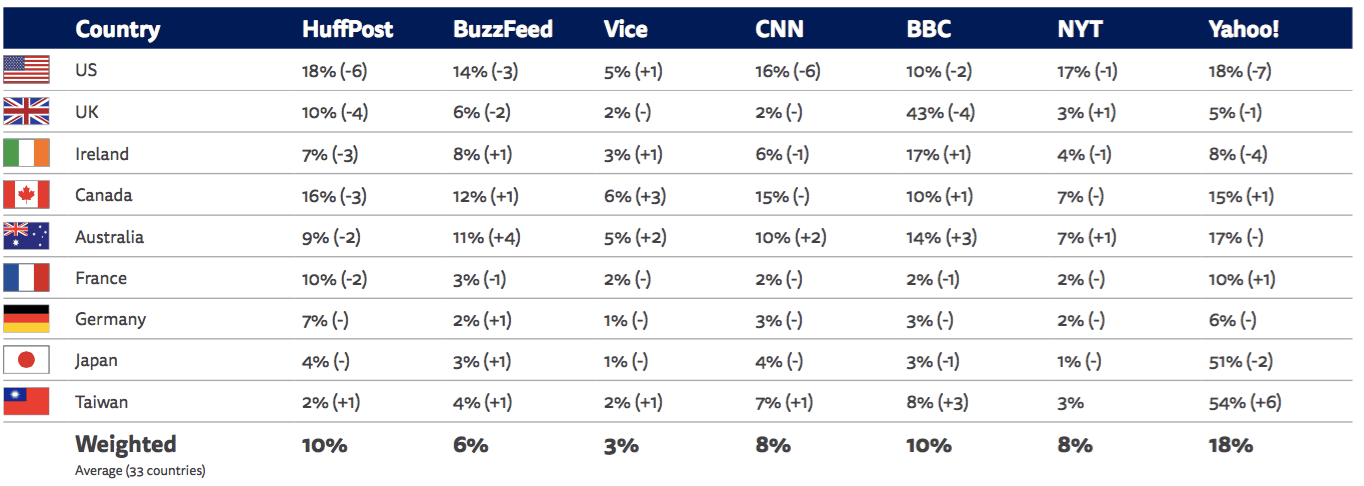 Yahoo! (18%), one of the internet’s first portals, remains by far the most popular global player even if it does largely aggregate content rather than produce original journalism. It is strong in North America, Latin America, and Asia.