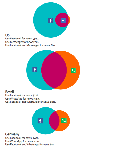 The majority of those who use messaging apps for news also use Facebook for news. This is particularly the case in the United States where Facebook Messenger dominates and WhatsApp is rarely used. But in Brazil and Germany, where WhatsApp is widespread, there is slightly less overlap with Facebook. In these markets more reading and sharing seems to have moved to WhatsApp as well as discussion — at least for some people.