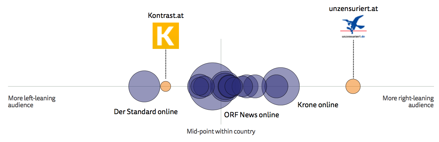 In Sweden, the audience of Fria Tider, Nyheter Idag, and Ledarsidorna are further to the right of the audience of the top 15 news brands. Academic research shows that these sites tend to come from a right-wing position and present themselves as alternatives to the legacy media, who they perceive as censoring critical information on issues such as immigration.1 In Austria, we also see that users of the far-right Unzensiriert (Uncensored), founded by a former Freedom Party (FPO) official, are furthest to the right of the audience map while Kontrast.at, a news blog run by the parliamentary club of the social-democratic party SPÖ, also pushed through social media channels, is more on the left side of our audience map.2