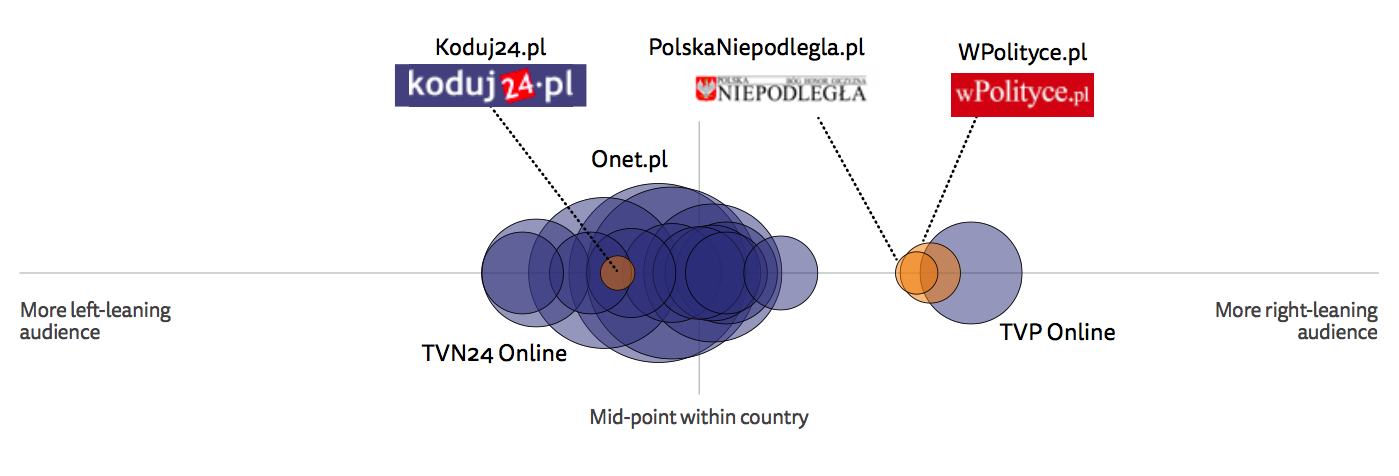 Further complicating the situation, in some Central and Eastern European countries, the government itself also engages in populist narratives, which are covered by sympathetic (or more directly controlled) traditional media outlets. Here the divisions between traditional and partisan brands may blur compared with the examples on the maps above. In Poland, for example, the mainstream public broadcaster TVP, which has an editorial line that supports the ruling Law and Justice party,3 appears in a similar position on our map to PolskaNiepodlegla.pl (Independent Poland) a right-wing nationalist site created in 2013. Recent headlines from this publication include ‘Islam is violence and rape’, ‘Poland for Poles’, and ‘German arrogance on the rise’4. Another site with a partisan audience is WPolityce.pl, which is at the centre of a number of sites (and a TV station) that are supportive of the Law and Justice party and its policies. By contrast, Koduj24.pl is a liberal news website launched in 2016 by a former public radio editor as an official news service of Komitet Obrony Demokracji, or the Committee for the Defence of Democracy, one of the major opposition organisations in Poland that recently mobilised thousands of people to demonstrate in defence of the constitutional tribunal and the judiciary.5