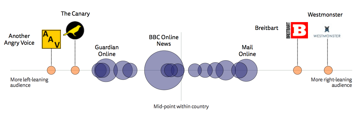 In the UK, the Another Angry Voice blog and the Canary website are placed further to the left of the map, because a high proportion of their users self-identify on the left. By contrast users of Breitbart UK and of the Brexit supporting Westmonster are further to the right of the map, because the majority of the users of these sites self-identify on the right.