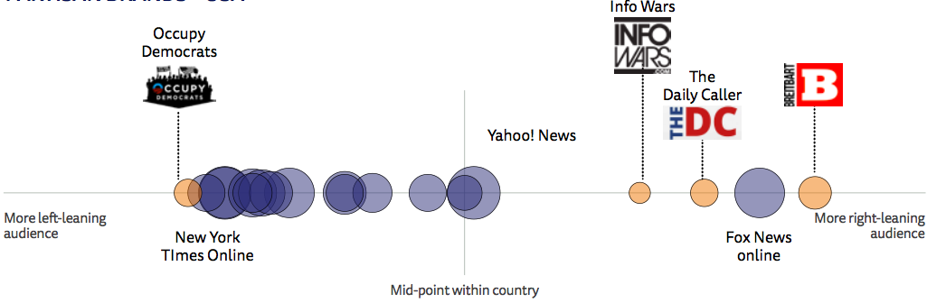 In the US, the users of the right-wing websites Breitbart, The Daily Caller, and InfoWars have an audience profile that is much further to the right than other websites (with the exception of Fox News). Occupy Democrats’ audience is at the left side of the political spectrum, close to other outlets with predominantly left-wing audiences like NPR and Huffington Post.