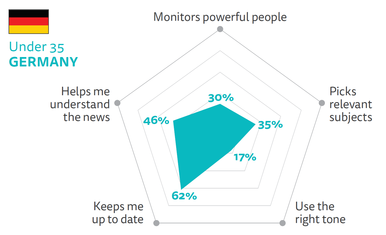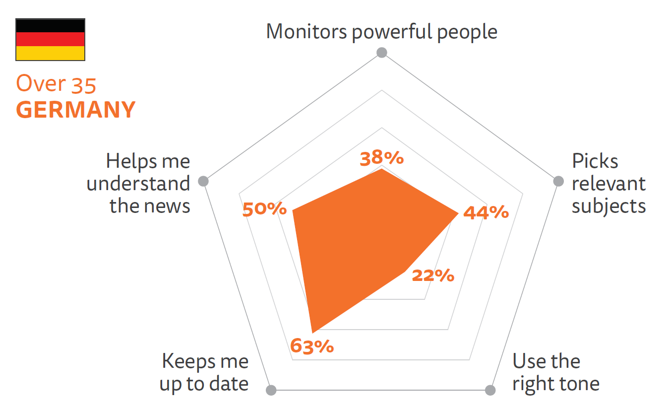 - Throughout this chapter, and unlike the Executive Summary, we reversed coded responses for the statements ‘the topics chosen by the news media do not feel relevant to me’ and ‘the news media often take too negative view of events’, and renamed them ‘the topics chosen by the news media feel relevant to me’ and ‘use the right tone’ for better readability and comparability. ↩