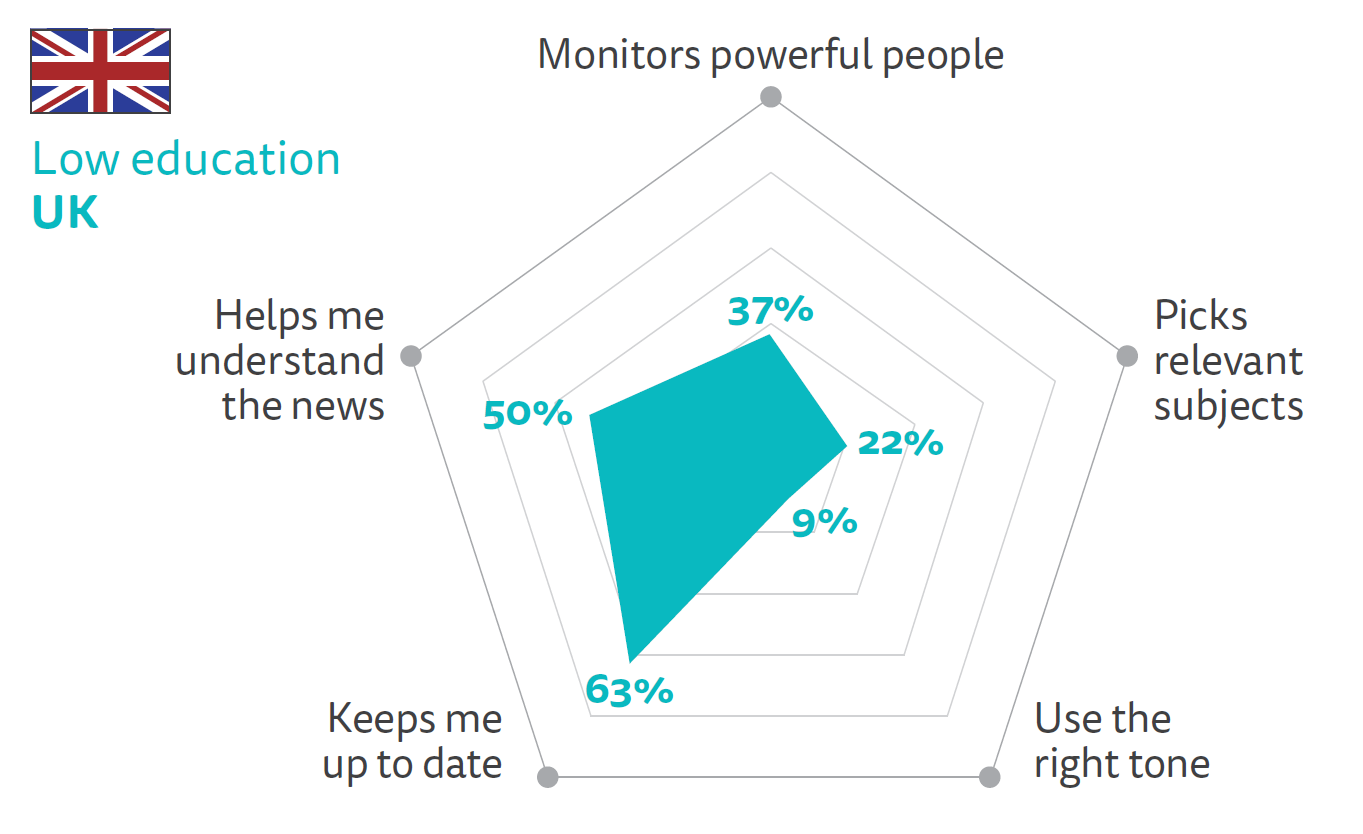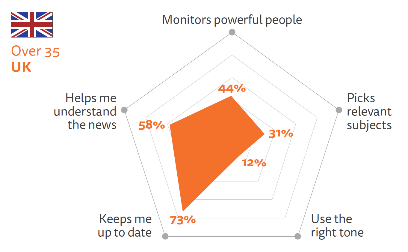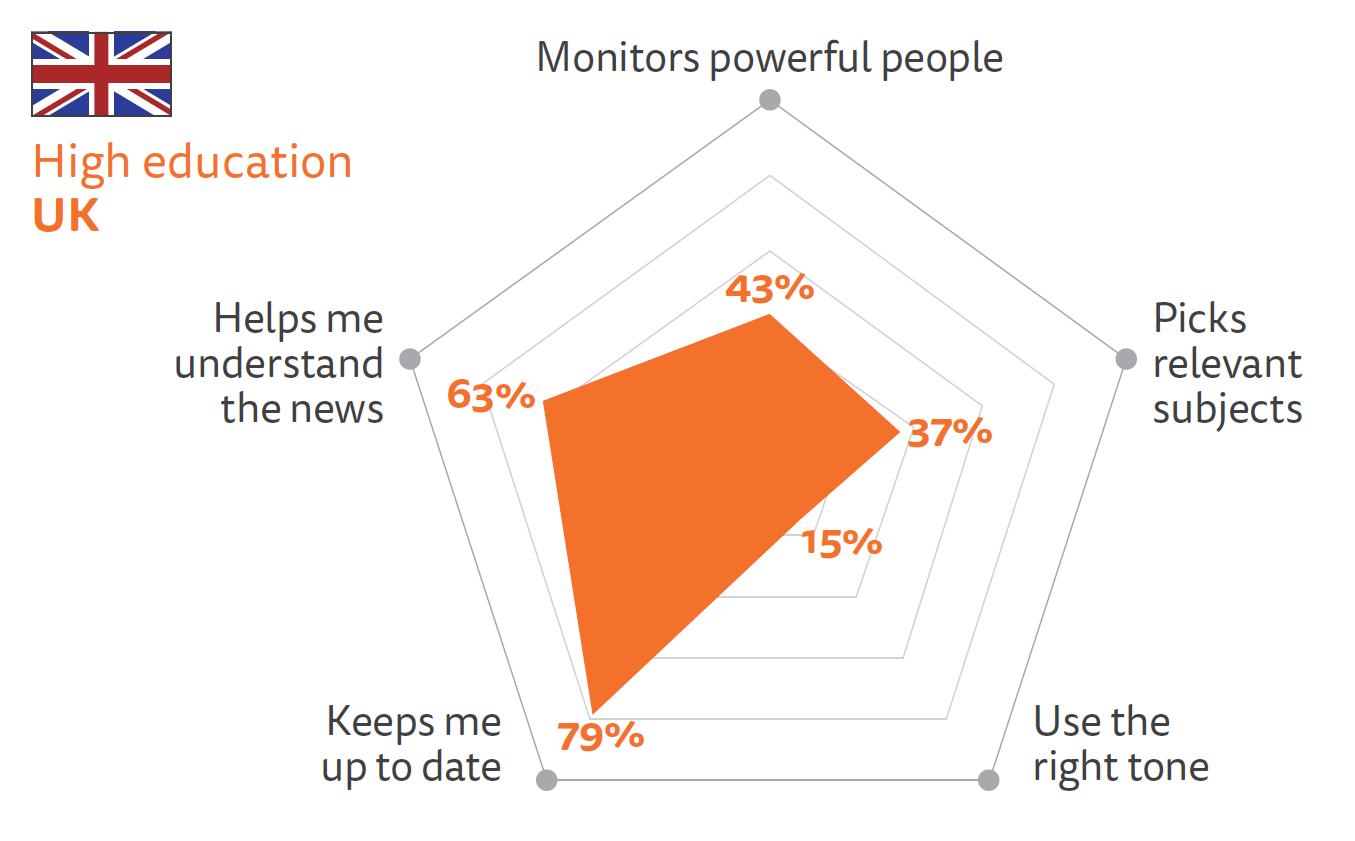 In the Executive Summary we saw that, across all countries, most people agree that the news media keep them up to date with what’s happening (62%), and that they help them understand current events (51%). But we should keep in mind that there is a significant minority (10–15%) that completely disagree that the news media help them in this regard – and perhaps equally concerning, around one-third who neither agree nor disagree.