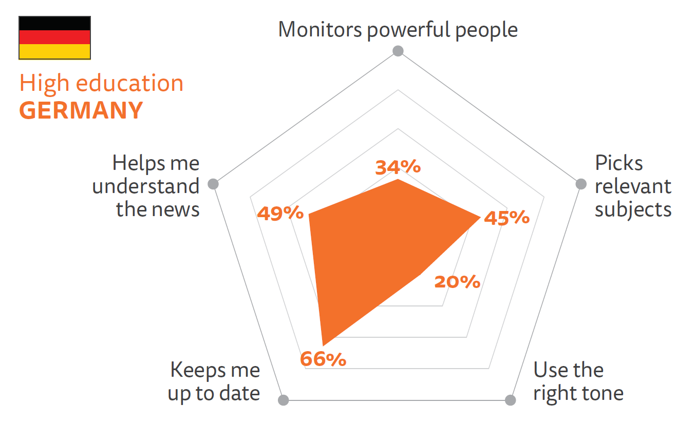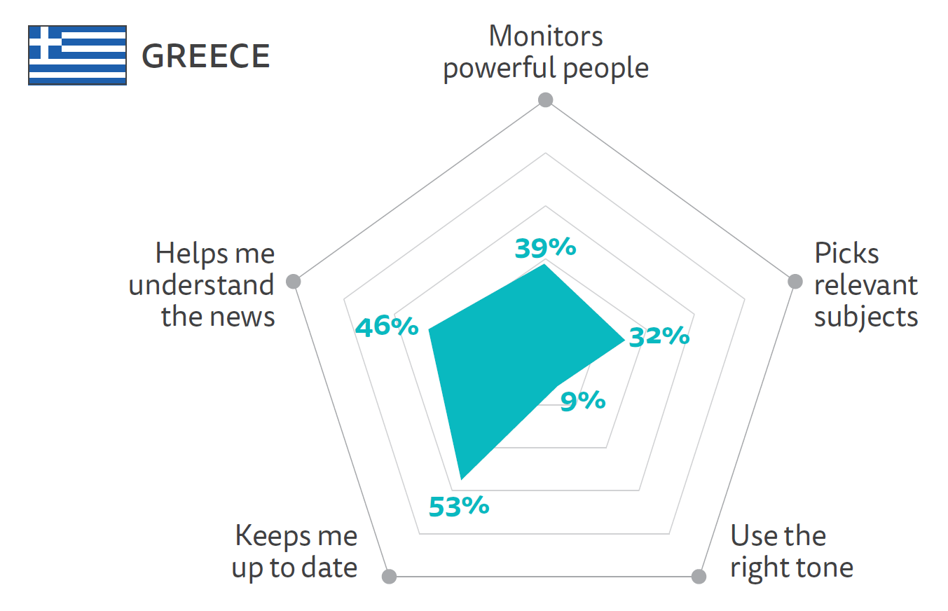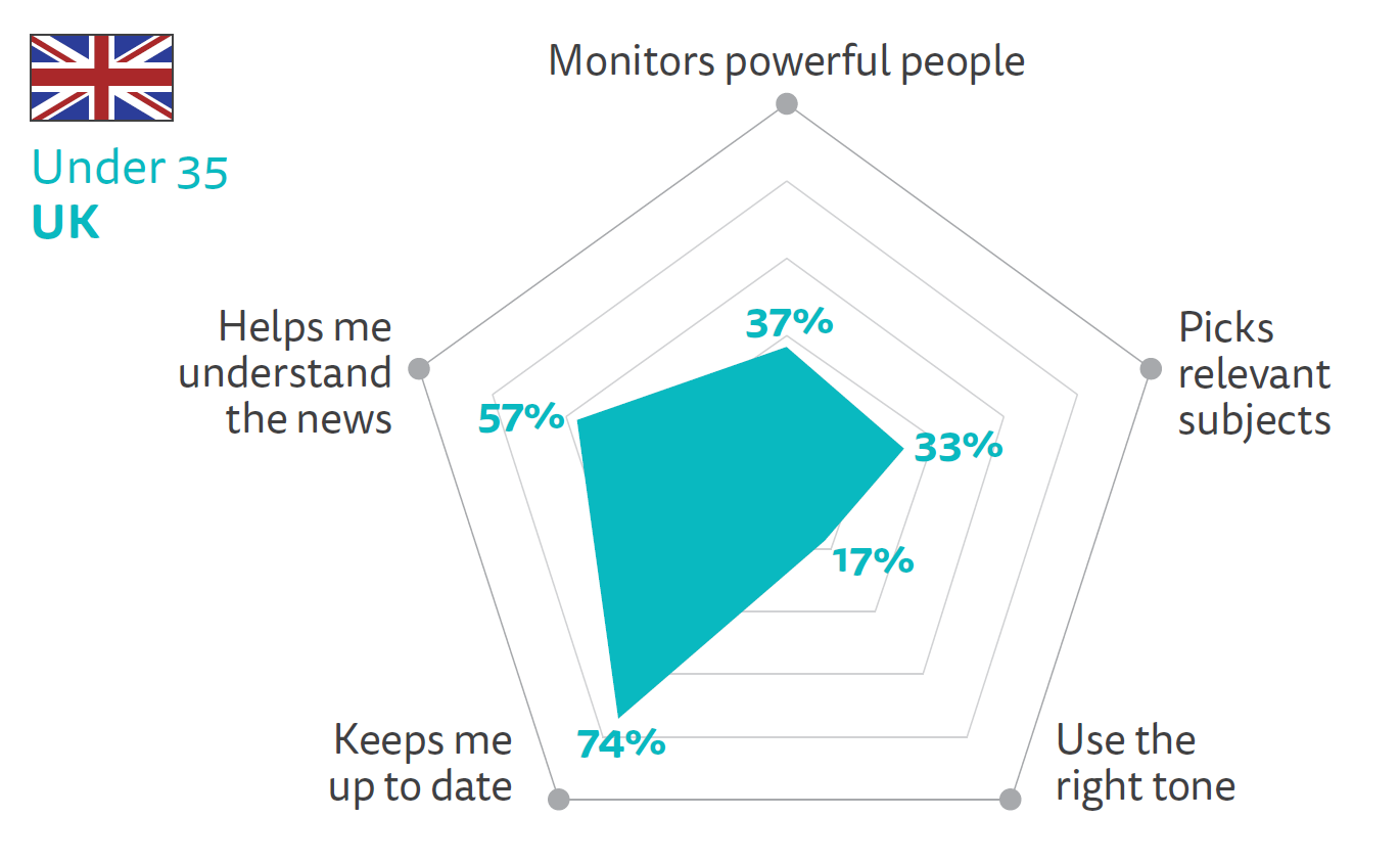 In the Executive Summary we saw that, across all countries, most people agree that the news media keep them up to date with what’s happening (62%), and that they help them understand current events (51%). But we should keep in mind that there is a significant minority (10–15%) that completely disagree that the news media help them in this regard – and perhaps equally concerning, around one-third who neither agree nor disagree.
